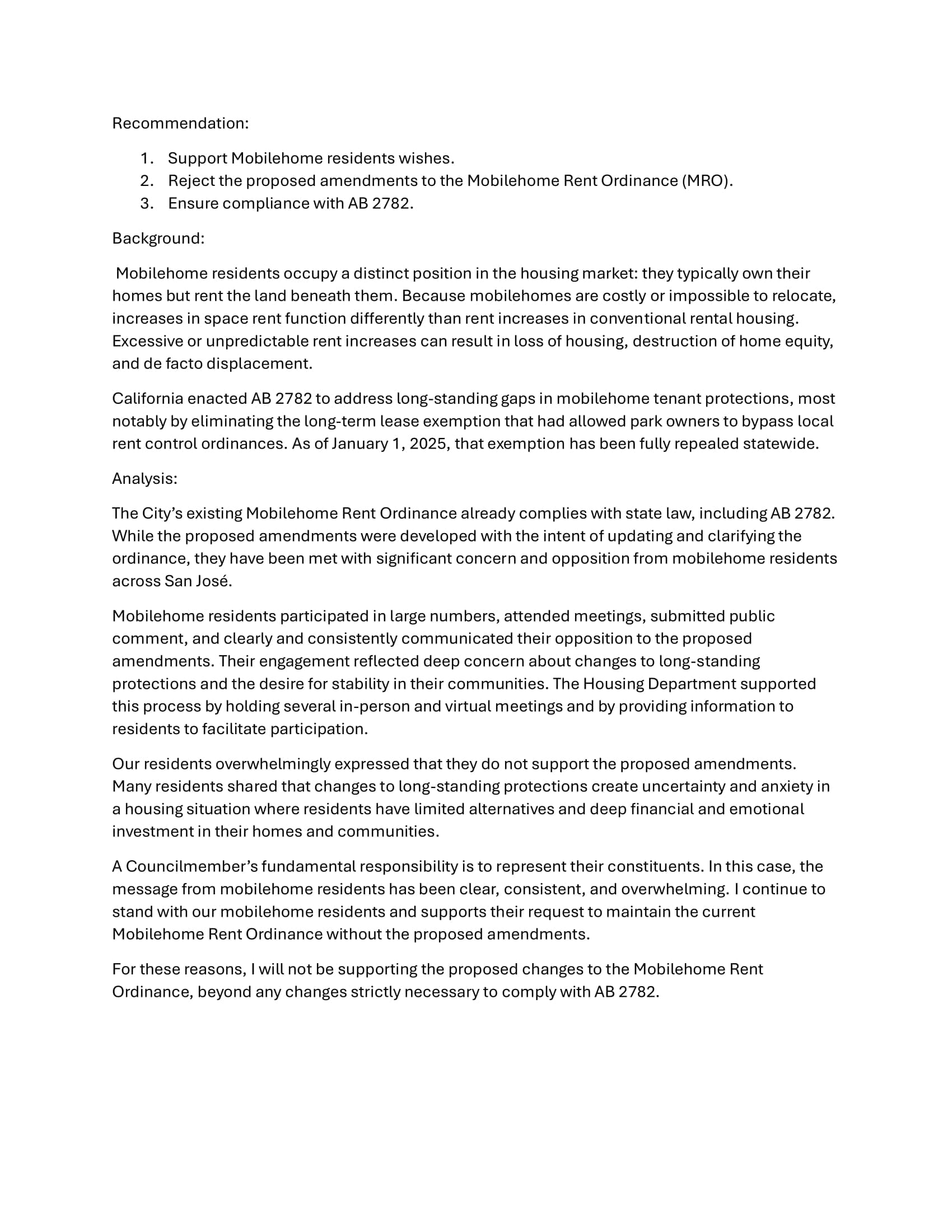 Theo bản lập luận chính sách được đưa ra liên quan đến đề nghị sửa đổi, Mobilehome Rent Ordinance hiện hành của San José đã tuân thủ luật tiểu bang, bao gồm AB 2782. Dù các sửa đổi được giới thiệu với mục tiêu “cập nhật và làm rõ” quy định, nhiều cư dân bày tỏ rằng việc thay đổi các biện pháp bảo vệ lâu nay sẽ tạo ra sự bất an trong một hoàn cảnh nhà ở mà họ gần như không có lựa chọn thay thế, trong khi lại gắn bó sâu sắc cả về tài chính lẫn tinh thần với nơi mình đang sống.