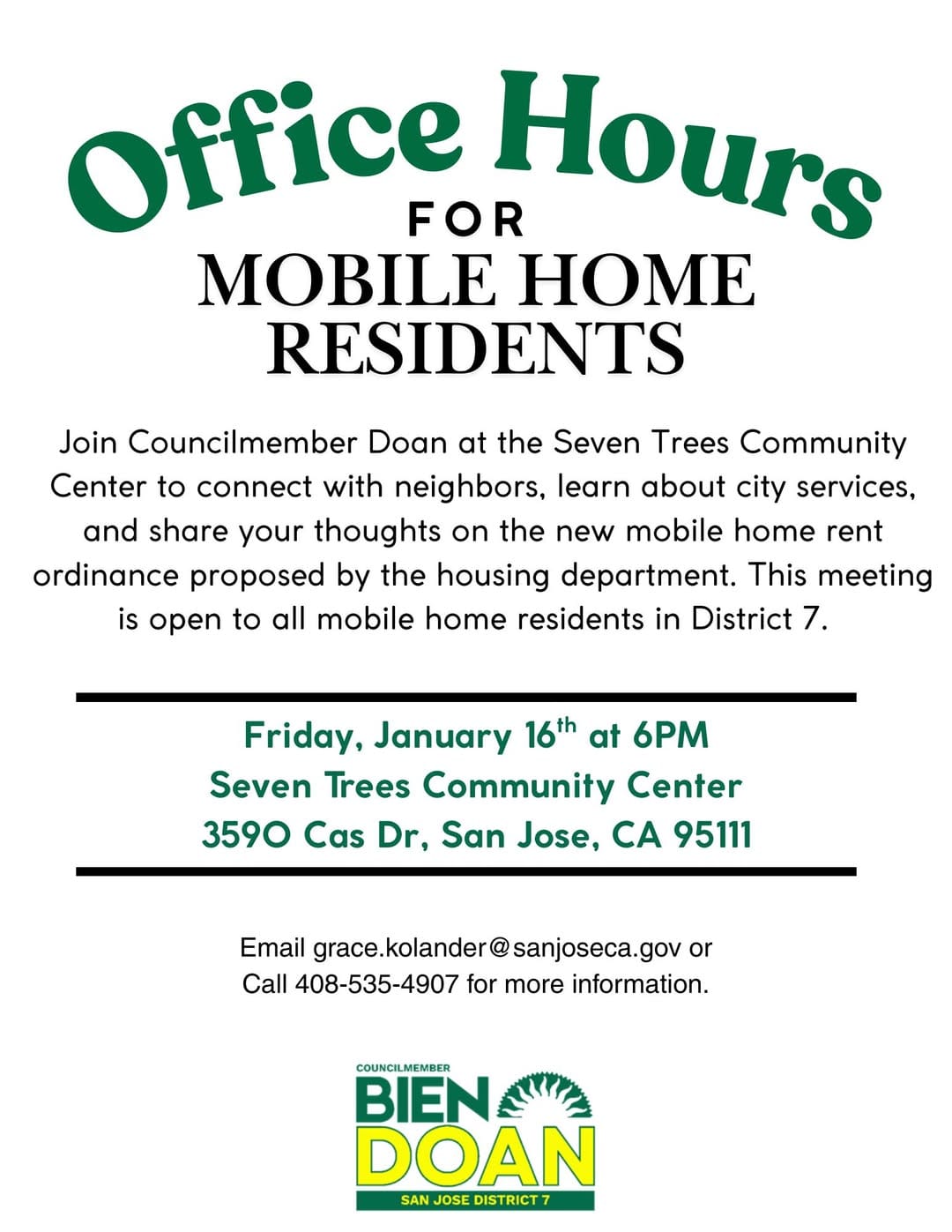 - What: Office Hours for Mobile Home Residents with Councilmember Bien Doan