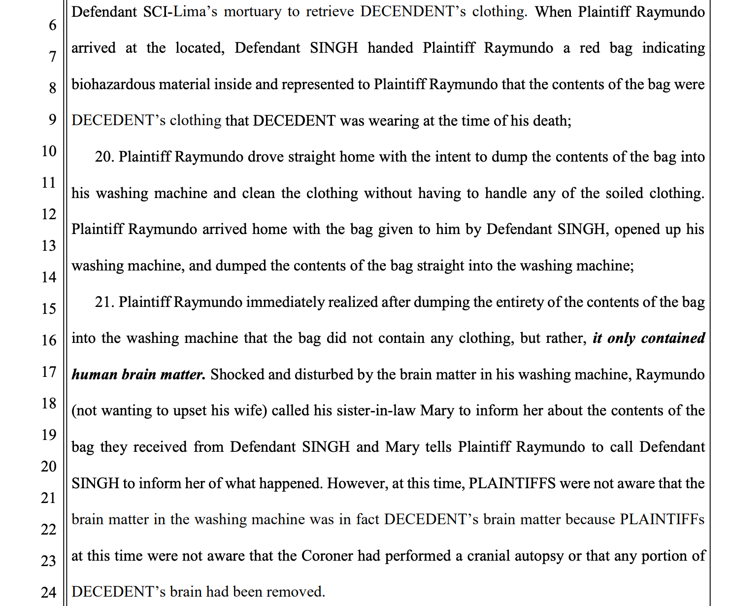 Theo đơn kiện, ngày 4 tháng 6, 2025, người cha là Raymundo Llanes đến nhà quàn để nhận lại quần áo con mình mặc lúc qua đời. Nữ giám đốc nhà quàn, Annette “Anita” Singh, trao cho ông một túi đỏ biohazard, khẳng định bên trong chỉ là quần áo.